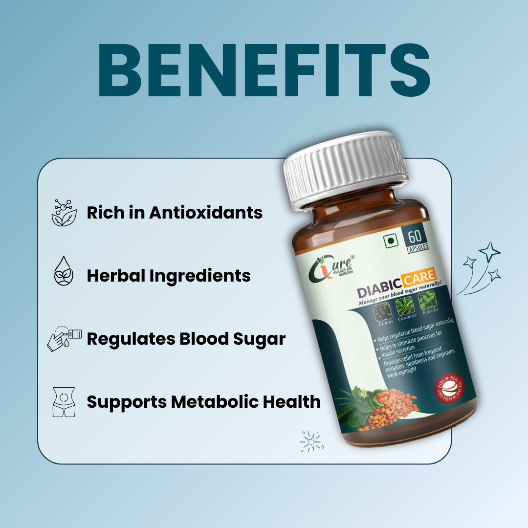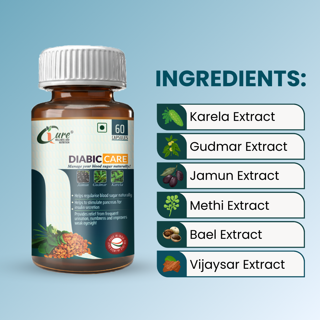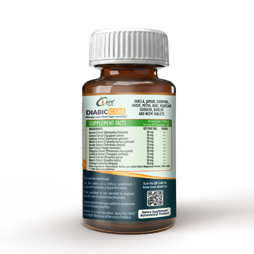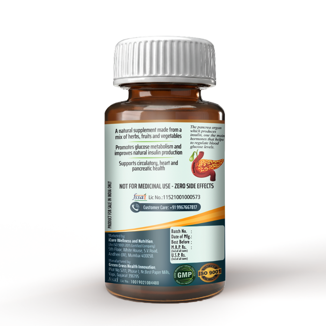 iCure Diabic Care is a specialized dietary supplement formulated to support healthy blood sugar levels. This unique blend combines the beneficial properties of Karela (Bitter Melon), Gudmar (Gymnema Sylvestre), and Jamun (Indian Blackberry) extracts, known for their traditional use in promoting glucose metabolism and insulin sensitivity.