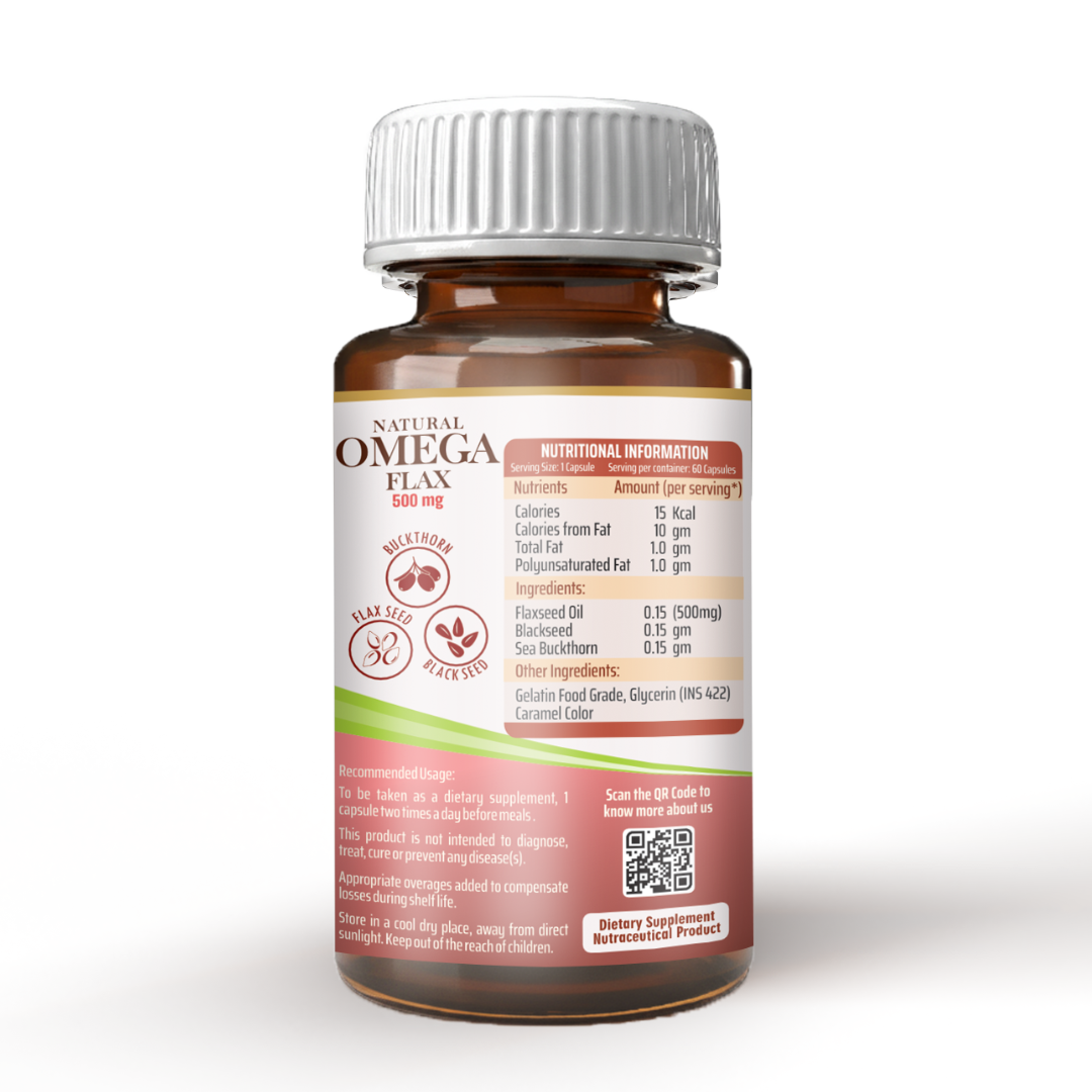 Our regular diet may not contain the goodness of natural foods abundant with Omega 3 such as salmon, fish, tuna, walnuts, olive oil and flaxseeds, thus lack in Omega 3. However, you can supplement this vital nutrient known for its health benefits by Omega Flax 500 mg softgels which contains flaxseed oil rich in Omega 3.